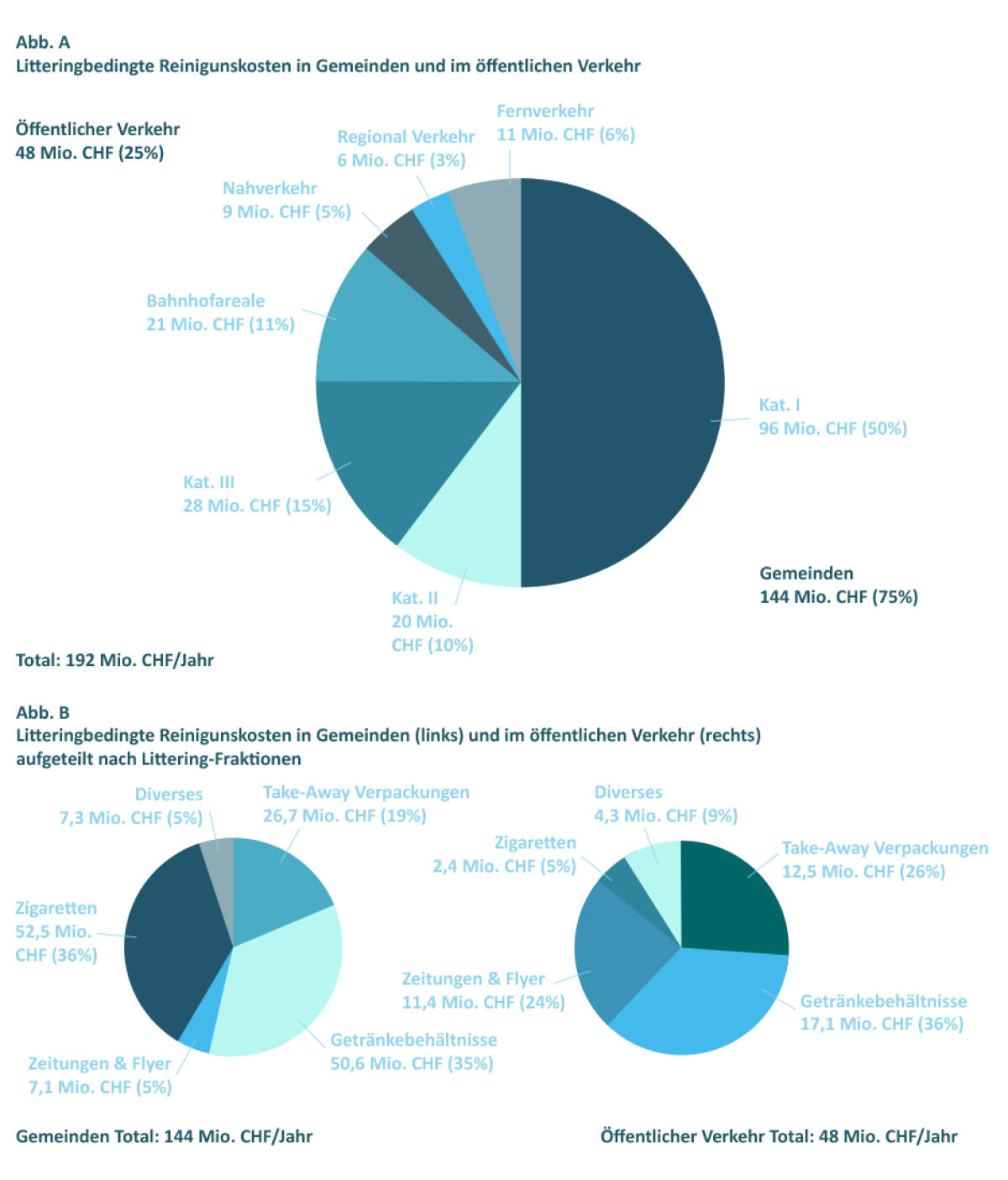 Der durch Littering in den Gemeinden und im öffentlichen Verkehr verursachte Reinigungsaufwand beträgt im Jahr 2010 rund 192 Millionen Franken. Hiervon entfallen 144 Mio. CHF auf die Gemeinden (75 %) und knapp 48 Mio. CHF auf den öffentlichen Verkehr (25 %) (siehe unten stehende Abbildung).