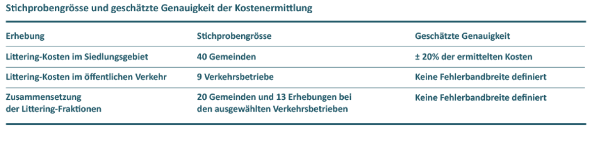 Durch die Wahl der Erhebungsmethodik kann für die Littering-Kosten der Gemeinden eine Genauigkeit von –46%/+56% angegeben werden. Die effektiven Littering- Kosten in der Gesamtheit der Schweizer Gemeinden liegen somit zwischen 77 Mio. und 225 Mio. CHF. Für die Littering-Kosten des öffentlichen Verkehrs kann keine Genauigkeit angegeben werden.