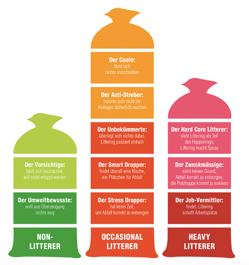 Die folgende Grafik zeigt verschiedene Motive auf, welche zu Littering führen. Dem Motiv und Kontext entsprechend können unterschiedliche Littering-Typen festgemacht werden. Welcher Littering-Typ bist Du?