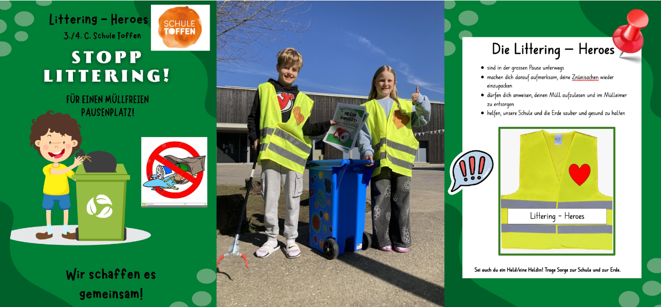 Am nationalen IGSU Clean-Up-Day im September 2024 haben sich alle Toffener Schüler*innen von der 3. bis zur 6. Klasse für eine saubere Gemeinde eingesetzt. Die 120 Kinder motivierten auch alle anderen Einwohner*innen von Toffen, sich an der Aufräum-Aktion zu beteiligen. Dafür wurden sie am Clean-Up-Day-Wettbewerb mit dem 2. Platz belohnt. Eine Klasse, nämlich die 3./4. C, setzt sich seit dem auch weiterhin für die Umwelt beim Schulhaus ein. Seit den Sportferien werden jede Woche zwei Kinder zu «Anti-Littering-Heroes» ernannt, die in der grossen Pause mit Leuchtwesten bekleidet, mit einem mobilen Abfallkübel, Greifzangen, Handschuhen und mit Gesprächen dafür sorgen, dass der Abfall korrekt entsorgt wird. Zudem machen Poster in den Klassenzimmern und beim Schulhauseingang auf die «Anti-Littering-Heroes» und auf einen müllfreien Pausenplatz aufmerksam. «Das Projekt zeigt bereits erste Erfolge: Die Kinder bemühen sich sehr, den Abfall zu trennen und in den korrekten Behälter zu werfen», freut sich die Lehrerin und Projektleiterin Franziska Heierle.