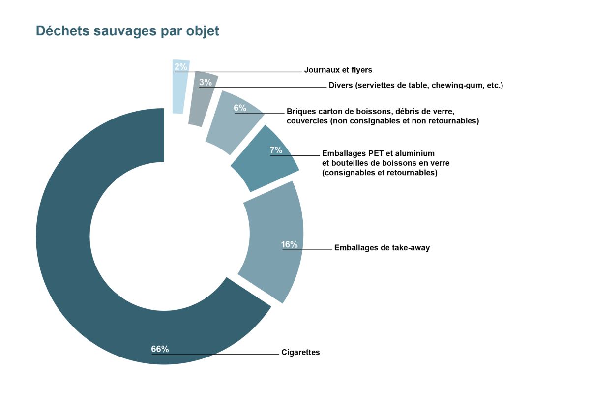 Les déchets sauvages NE doivent PAS être confondus avec l’élimination illégale des déchets des ménages, de l’industrie ou de l’artisanat dans le but d’éviter les coûts d’élimination. Une étude très remarquée sur les déchets sauvages de l’Office fédéral de l’environnement (OFEV) a publié en 2011 la répartition suivante des objets jetés sur la voie publique en Suisse :