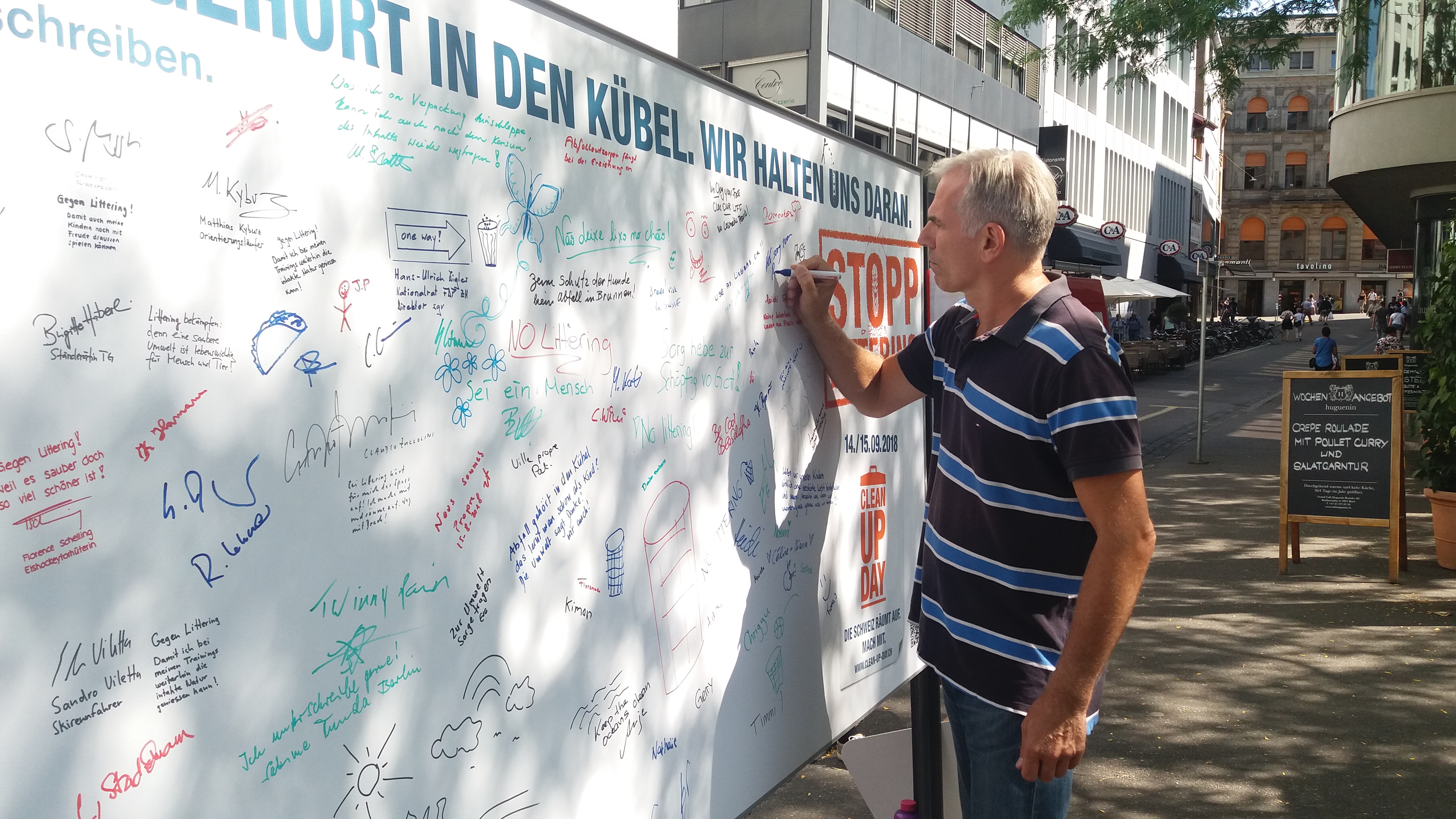 Basel hat genug von herumliegendem Abfall und hat dies heute auf dem Barfüsserplatz deutlich gemacht: An einer Plakat-Aktion der IG saubere Umwelt (IGSU) bekannten sich heute Baslerinnen und Basler sowie Politikerinnen und Politiker wie Lorenz Nägelin und Tonja Zürcher gegen Littering. Mit Unterschriften, Sprüchen und Zeichnungen drückten sie ihren Missmut gegenüber Abfallsündern aus und sicherten ihre Mithilfe im Kampf gegen Littering zu.