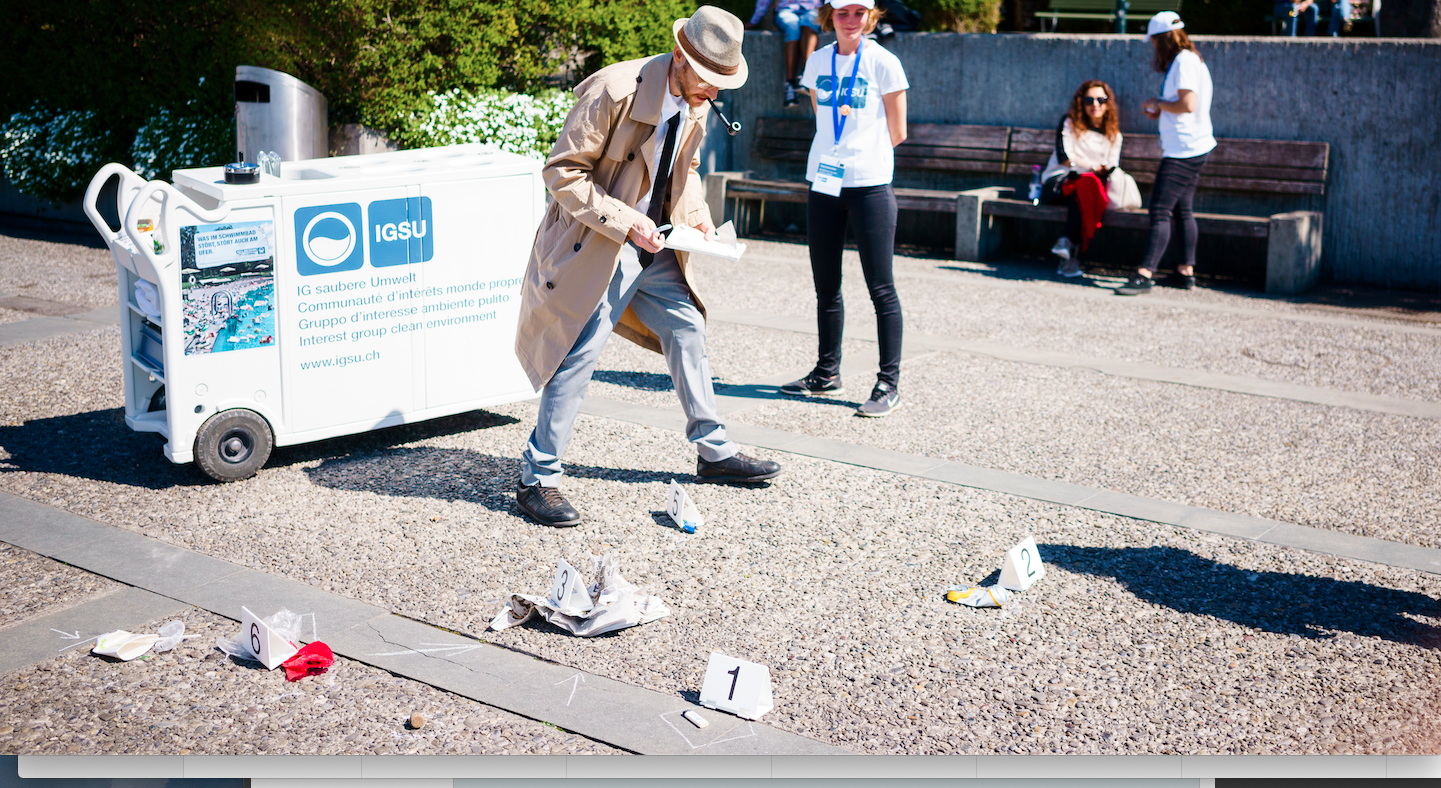 Heute Morgen bot sich den Passantinnen und Passanten in Zürich ein unschönes Bild: Getränkeflaschen, Essens-Verpackungen, Taschentücher und Zigarettenstummel störten die Frühlingsidylle am See. Mit Hilfe der IGSU-Botschafter untersuchte ein IGSU-Detektiv die Beweisstücke und nahm verdächtige Personen in Gewahrsam. Doch welcher der fünf fiktiven Verdächtigen ist der Täter? Passantinnen und Passanten konnten den Detektiven bei seinen Ermittlungen unterstützen. Wer den Täter entlarvte, wurde von den IGSU-Botschaftern mit einem Tool für die korrekte Abfallentsorgung belohnt, wie beispielsweise einem «Abfallsack-Böxli».