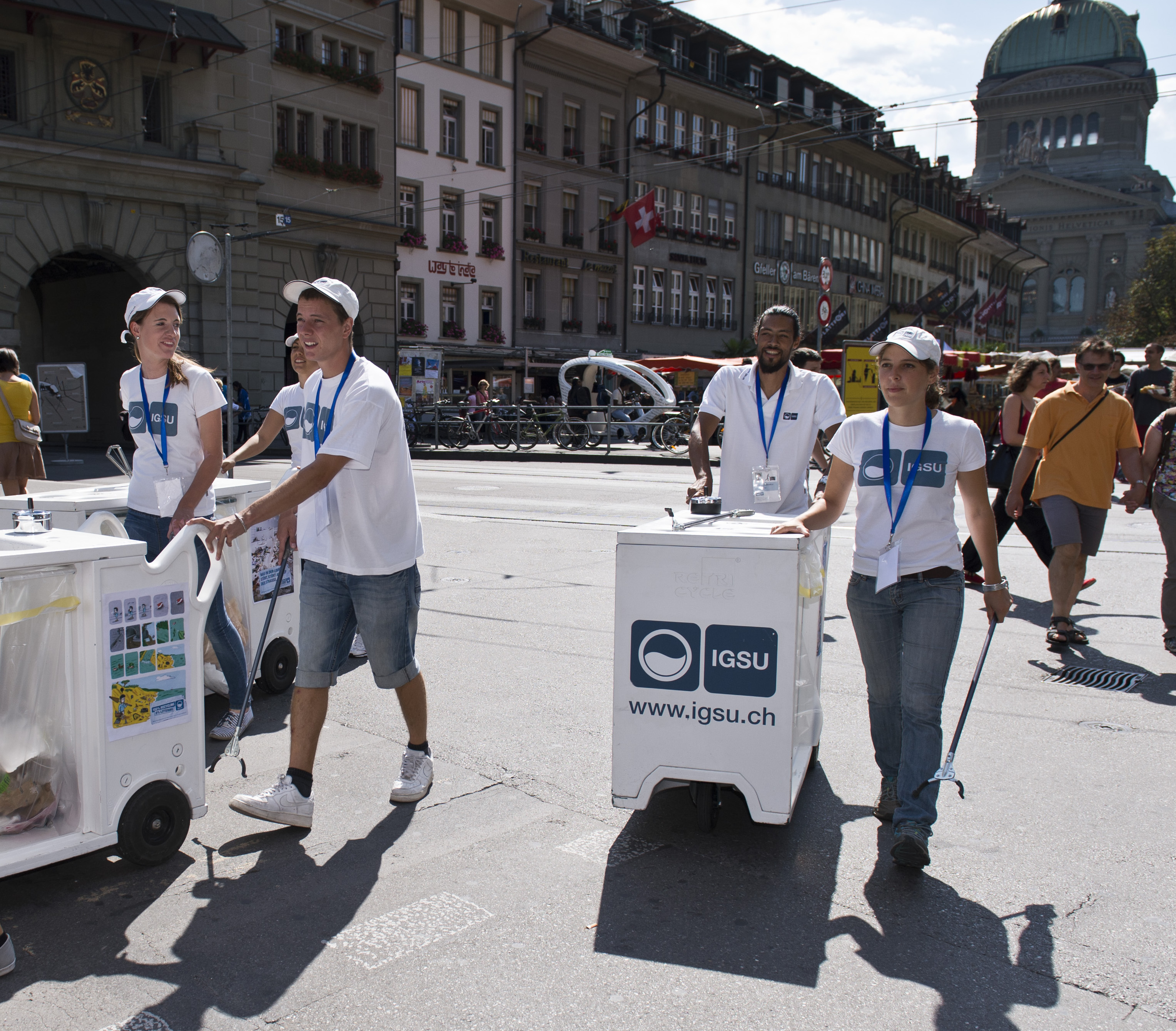 Noch bis zum 13. September sind die IGSU-Botschafter-Teams mit ihren Recyclingmobilen auf stark frequentierten Strassen, Parks und Plätzen in der Stadt Bern unterwegs. Die Teams sprechen die Passanten auf eine humorvolle, offene und freundliche Art an und informieren persönlich und zielgruppenspezifisch über den richtigen Umgang mit Abfall und recycelbaren Wertstoffen. Mit ihrer motivierenden Art regen sie Jung und Alt an, ihr eigenes Littering-Verhalten zu überdenken. Die Sensibilisierungsmassnahmen der IGSU ergänzen laut Stefan Schwarz, Generalsekretär der Direktion für Tiefbau, Verkehr und Stadtgrün die städtischen Anstrengungen sehr gut: „Die IGSU-Botschafter-Teams sind für die Stadt Bern jedes Jahr eine Bereicherung. Die persönlichen Sensibilisierungsaktivitäten sind ein wirksamer Weg gegen das Littering sowie zur Steigerung der Wertschätzung des öffentlichen Raums. Zudem ergänzen sie unsere Aktivitäten im Rahmen der Kampagne „Subers Bärn – zäme geits!“.“