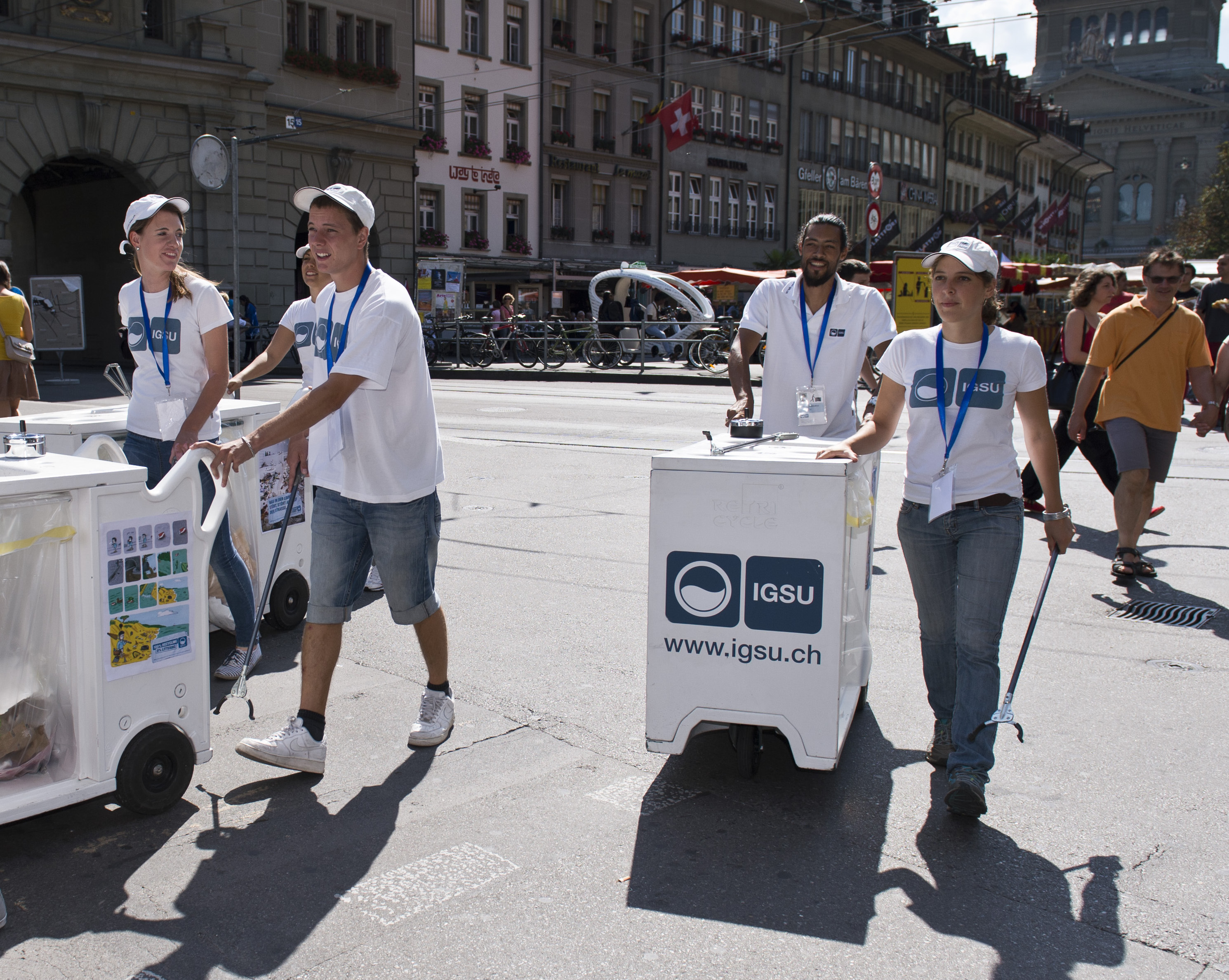 Noch bis zum 13. September sind die IGSU-Botschafter-Teams mit ihren Recyclingmobilen auf stark frequentierten Strassen, Parks und Plätzen in der Stadt Bern unterwegs. Die Teams sprechen die Passanten auf eine humorvolle, offene und freundliche Art an und informieren persönlich und zielgruppenspezifisch über den richtigen Umgang mit Abfall und recycelbaren Wertstoffen. Mit ihrer motivierenden Art regen sie Jung und Alt an, ihr eigenes Littering-Verhalten zu überdenken. Die Sensibilisierungsmassnahmen der IGSU ergänzen laut Stefan Schwarz, Generalsekretär der Direktion für Tiefbau, Verkehr und Stadtgrün die städtischen Anstrengungen sehr gut: „Die IGSU-Botschafter-Teams sind für die Stadt Bern jedes Jahr eine Bereicherung. Die persönlichen Sensibilisierungsaktivitäten sind ein wirksamer Weg gegen das Littering sowie zur Steigerung der Wertschätzung des öffentlichen Raums. Zudem ergänzen sie unsere Aktivitäten im Rahmen der Kampagne „Subers Bärn – zäme geits!“.“