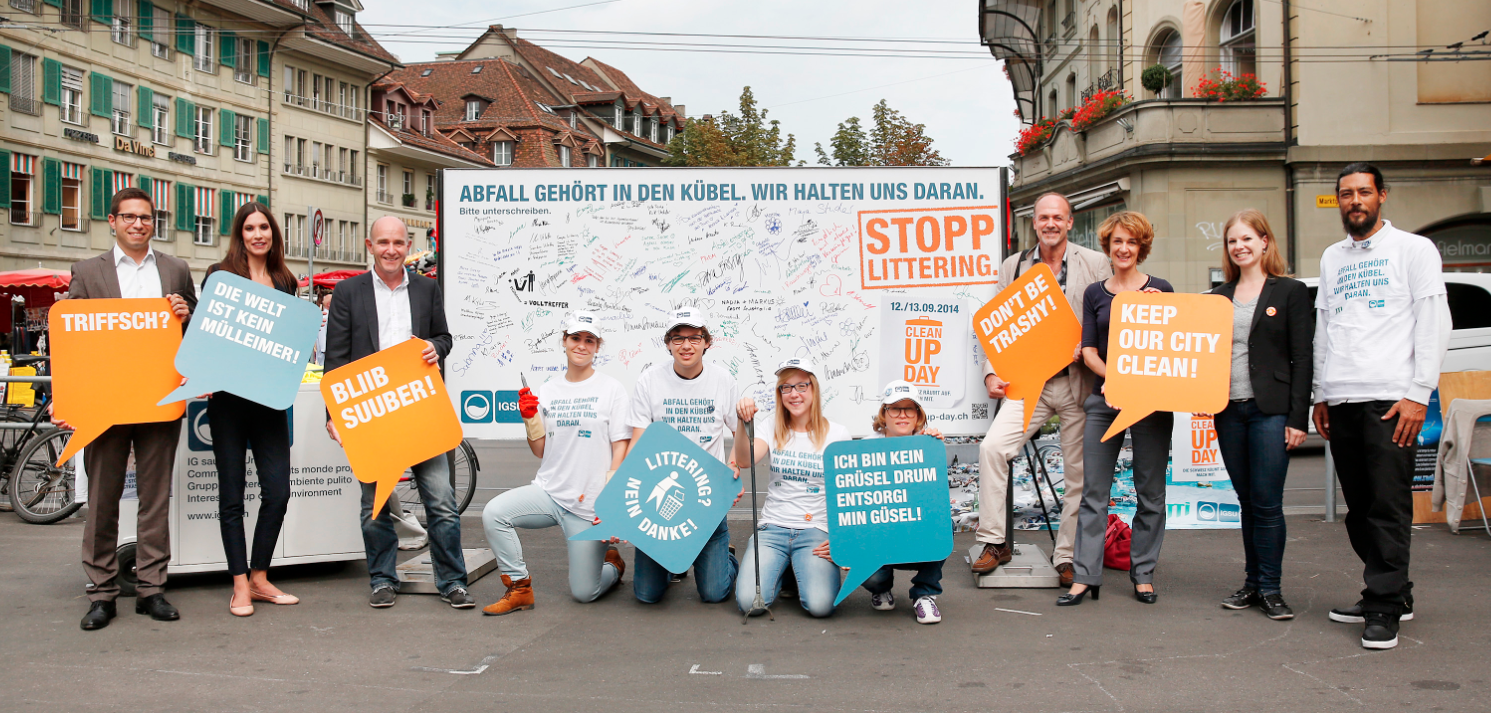Littering kostet, verunstaltet den öffentlichen Raum und beeinträchtigt die Lebensqualität. Dieser Meinung sind auch mehrere Hundert Bernerinnen und Berner. In einer Aktion der IG saubere Umwelt (IGSU) haben sie am 9. September 2014 auf dem Bärenplatz beim Bundeshaus in Bern ein Zeichen gegen das absichtliche oder unbedachte Wegwerfen von Abfall gesetzt.