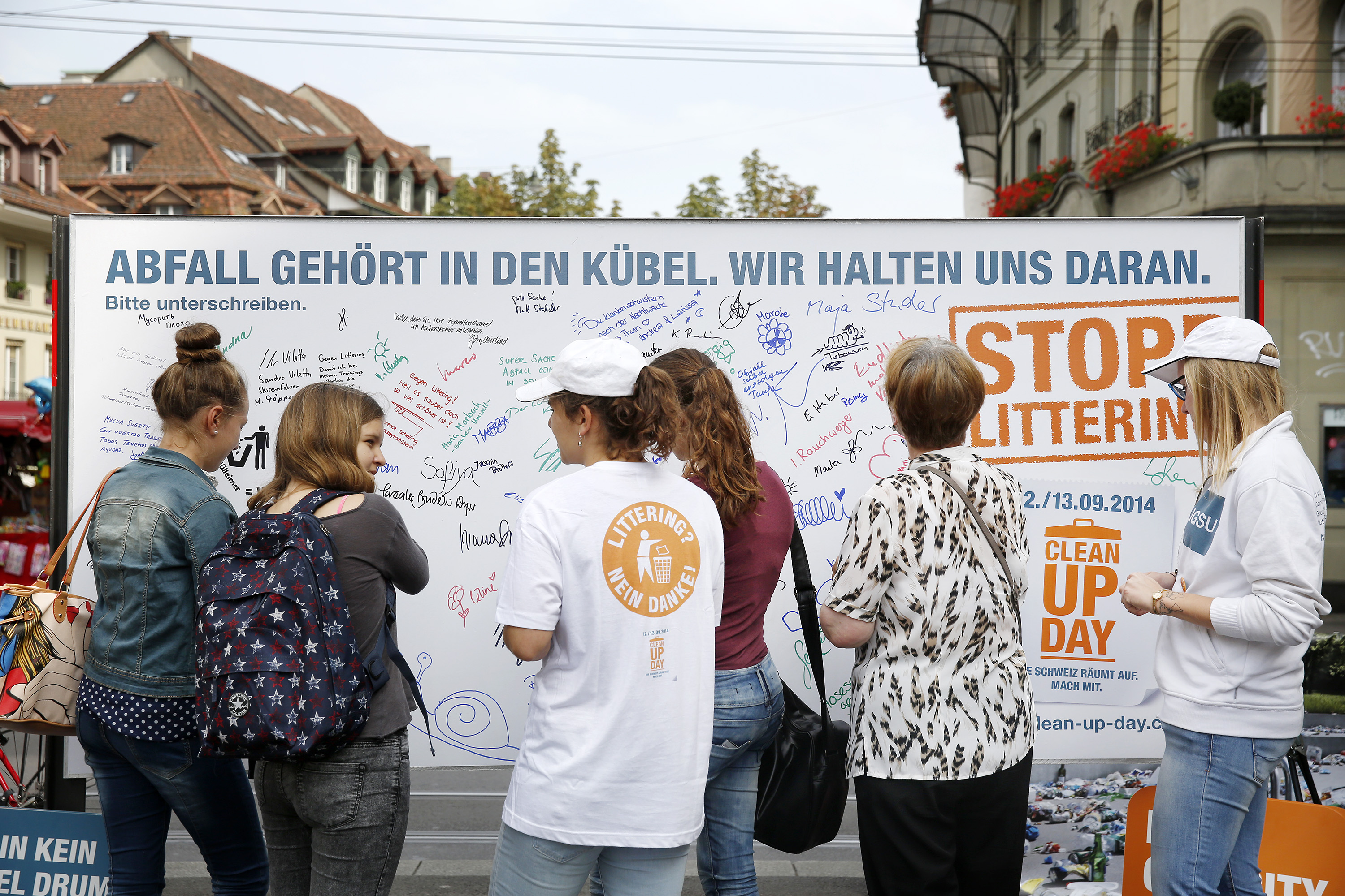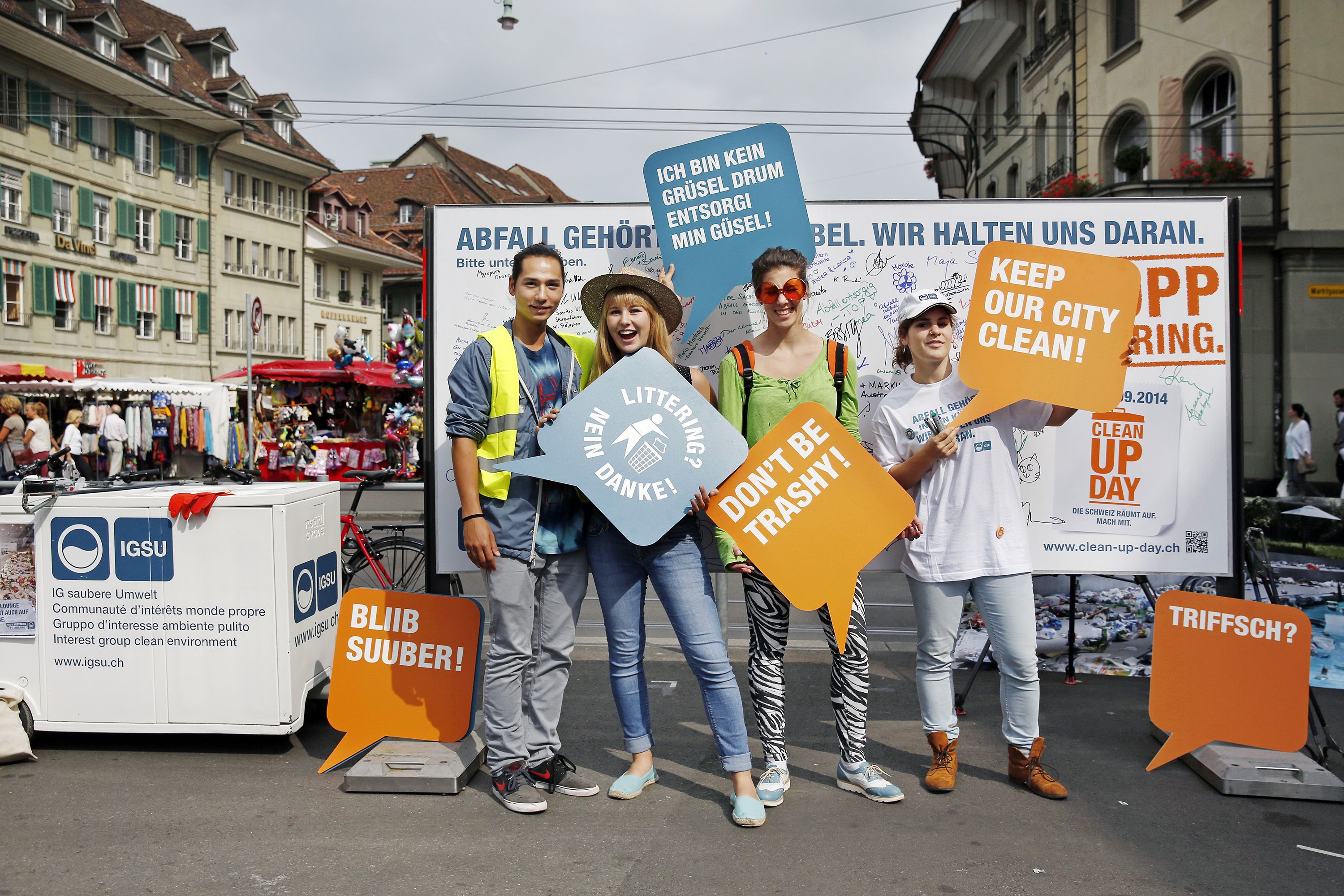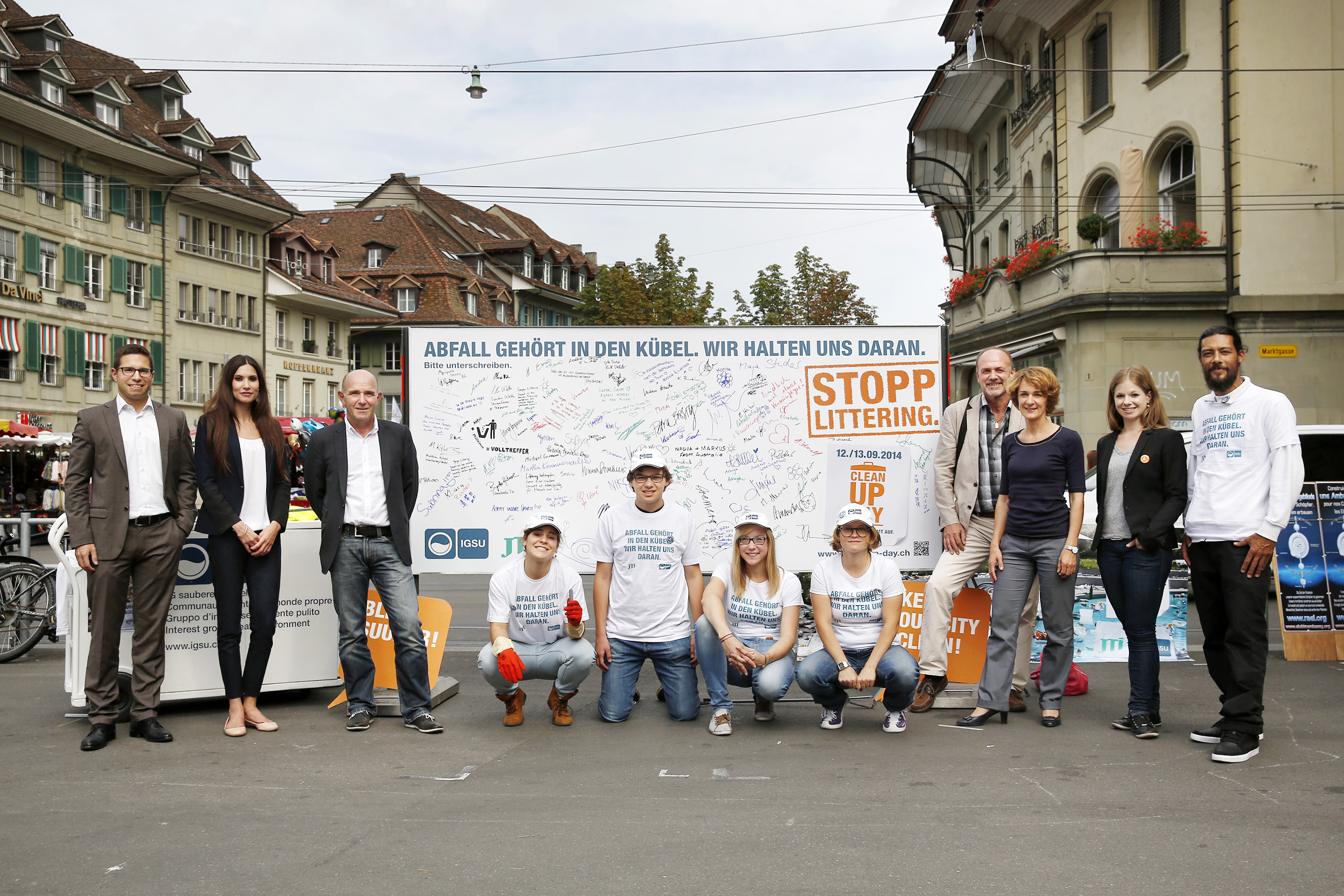 Littering kostet, verunstaltet den öffentlichen Raum und beeinträchtigt die Lebensqualität. Dieser Meinung sind auch mehrere Hundert Bernerinnen und Berner. In einer Aktion der IG saubere Umwelt (IGSU) haben sie am 9. September 2014 auf dem Bärenplatz beim Bundeshaus in Bern ein Zeichen gegen das absichtliche oder unbedachte Wegwerfen von Abfall gesetzt.