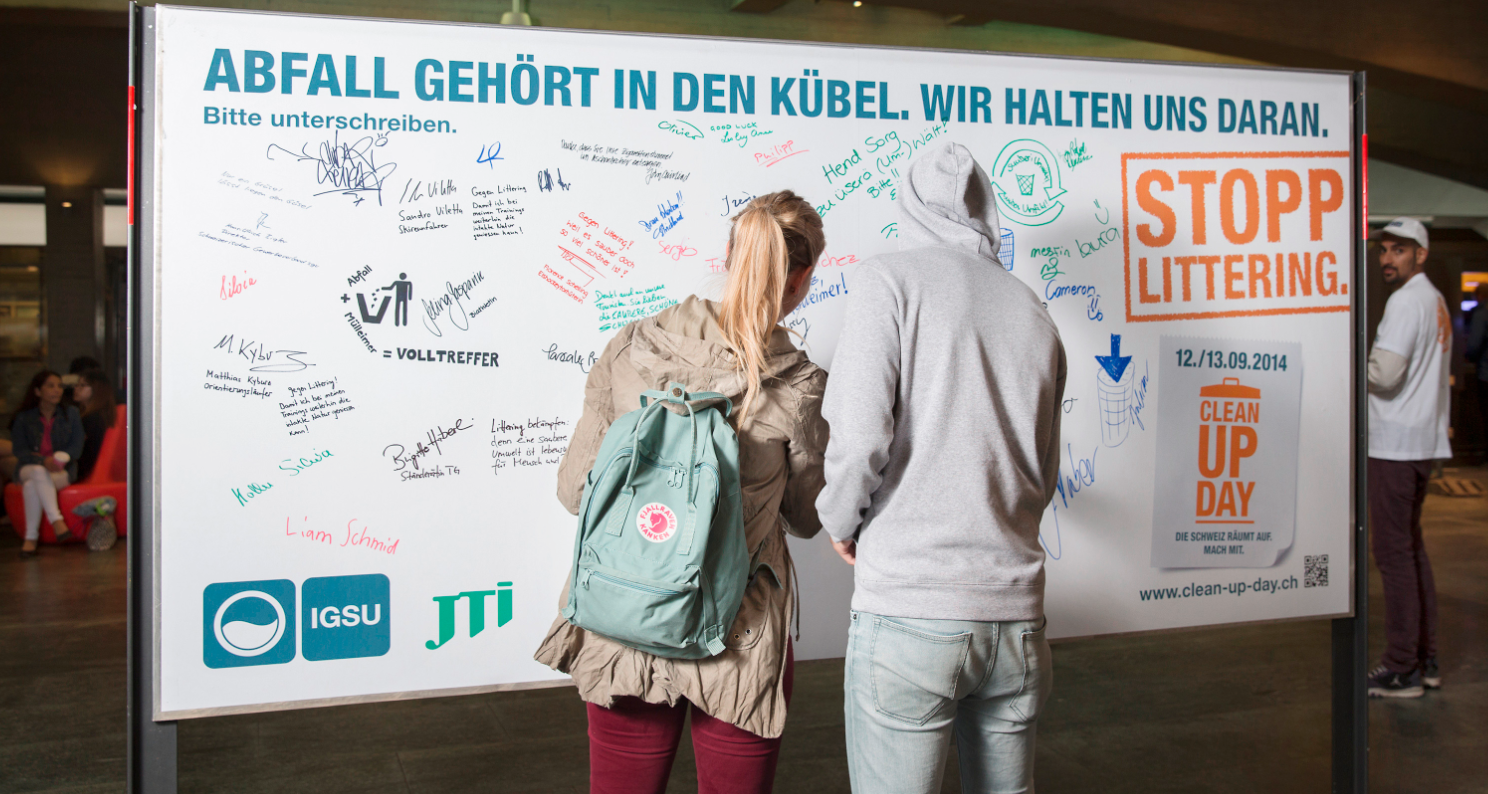 «Viele Menschen fühlen sich dem Fehlverhalten einer Minderheit hilflos ausgesetzt», sagt Nora Steimer, Geschäftsleiterin der IGSU. «Mit Massnahmen wie der Plakataktion zeigen wir, dass jeder etwas gegen Littering tun kann.» Die nächste grosse Möglichkeit, sich gegen Littering zu engagieren, bietet der nationale Clean-Up-Day, in dessen Rahmen die Plakataktion stattfand. Am 12. und 13. September werden wie schon im letzten Jahr Tausende Schweizerinnen und Schweizer öffentliche Plätze, Wiesen und Strassen aufräumen und so ein Zeichen gegen Littering und für eine saubere Schweiz setzen.