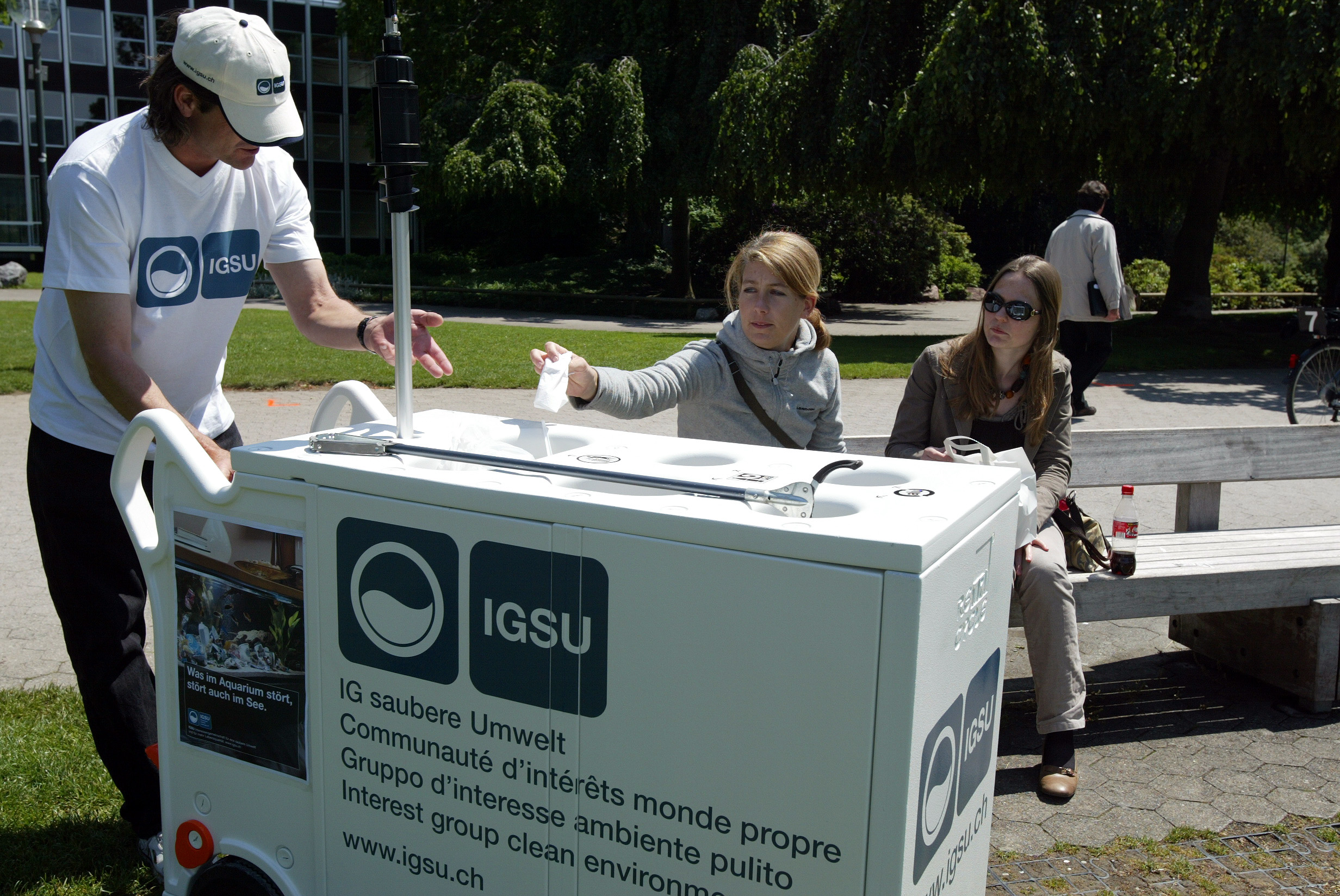Dans les villes plus particulièrement, les emballages de repas à l’emporter, les bouteilles, les canettes, les journaux, les mégots de cigarettes ne sont pas toujours déposés dans les poubelles ou dans les conteneurs de collecte séparée. On en trouve trop souvent jetés négligemment sur le sol. Les trois ambassadeurs de l’IGSU, Urs Freuler, Cédric Québatte et Gregor Muchow, qui ont déjà déployé avec succès cet été leurs efforts de lutte contre les déchets sauvages (littering en anglais) à Zurich, Saint-Gall et à Bâle, poursuivent maintenant leur mission à Genève également. Avec leurs Recycling-Mobiles, on les trouve à l’oeuvre sur les rives du lac, dans la vieille ville et dans d’autres points névralgiques. Ils motivent les pollueurs environnementaux en les incitant à pratiquer une élimination correcte des déchets, répondent aux questions des passants et collectent les déchets qui traînent.