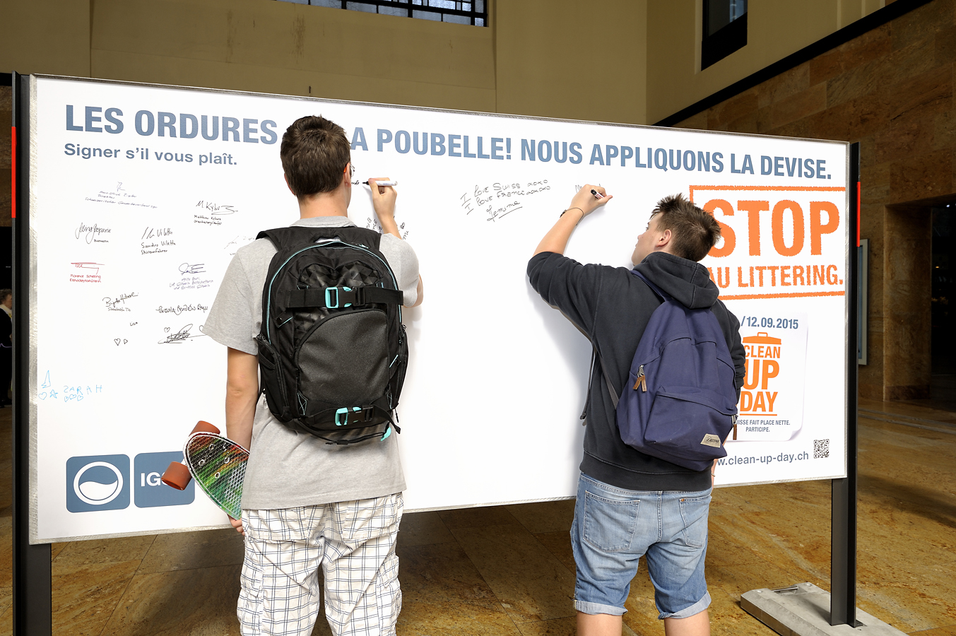Genève en a assez des déchets sauvages et l’a fait savoir aujourd'hui à la gare de Genève-Cornavin: à l’occasion d’une action par voie d’affichage d’IGSU (Communauté d’intérêts pour un monde propre), des centaines Genevoises et Genevois ont manifesté leur rejet du littering. En inscrivant leurs signatures, slogans et dessins, ils ont exprimé leur mécontentement contre les pollueurs et assuré de contribuer activement à la lutte contre le littering.
