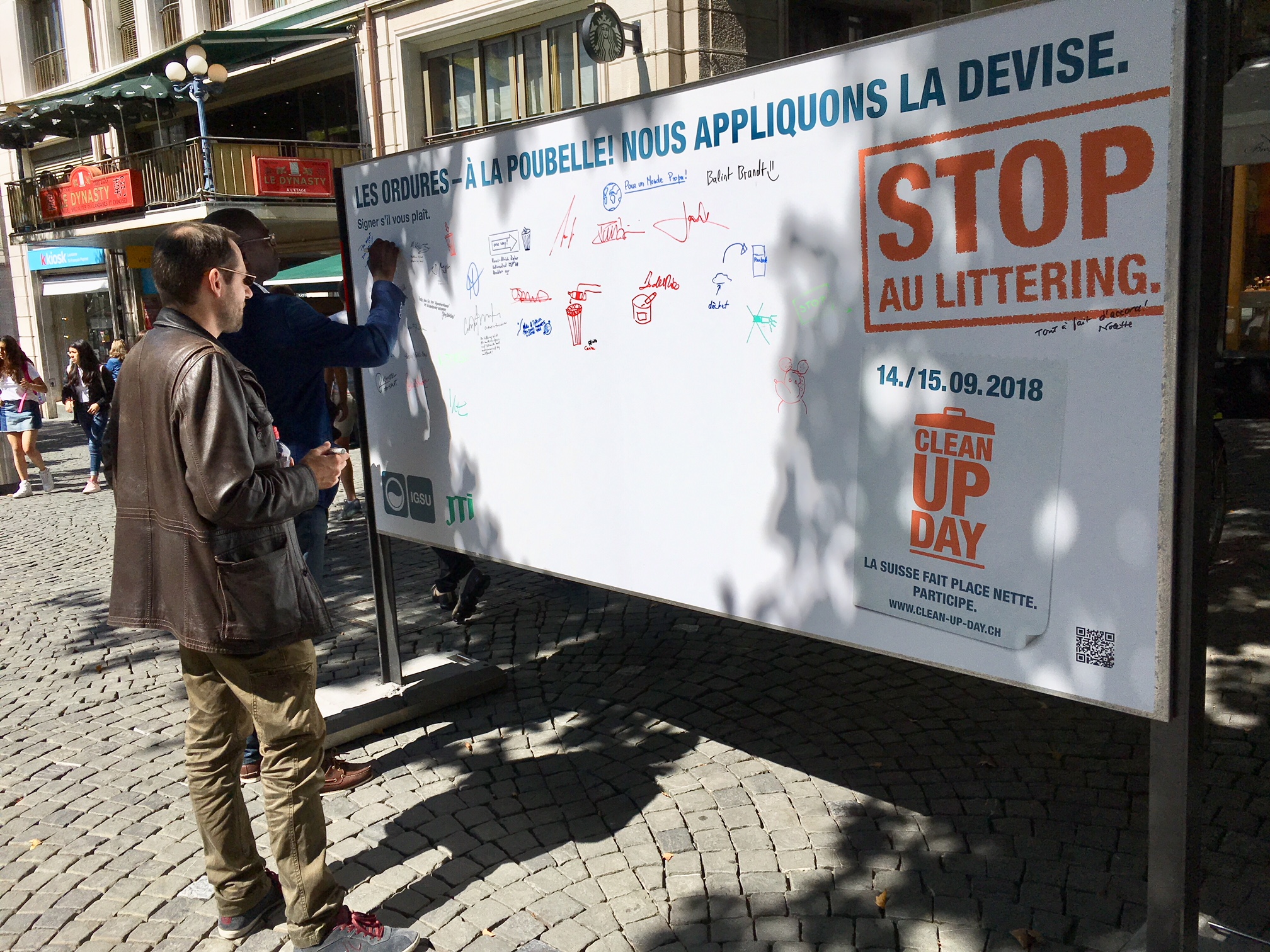 Le littering n’est pas une peccadille. C’est avec cette devise que les équipes d’ambassadeurs d’IGSU (Communauté d’intérêts monde propre) sillonnent cette année la Suisse. Aujourd'hui, ils ont incité les passant(e)s sur la place Saint-François à Lausanne à se prononcer contre le littering et à en exprimer leur opinion sur les affiches blanches. Ces dernières années, ces affiches ont permis de recueillir signatures, poèmes et bandes dessinées dans plusieurs villes. La directrice d’IGSU, Nora Steimer, s’est félicitée de la réussite de cette action: «Les Lausannoises et Lausannois sont très créatifs. Nombreux sont ceux qui ont lancé avec des illustrations impressionnantes et des commentaires pleins d’esprit un appel contre le littering.» L’action par voie d’affiches est soutenue par JTI (Japan Tobacco International).