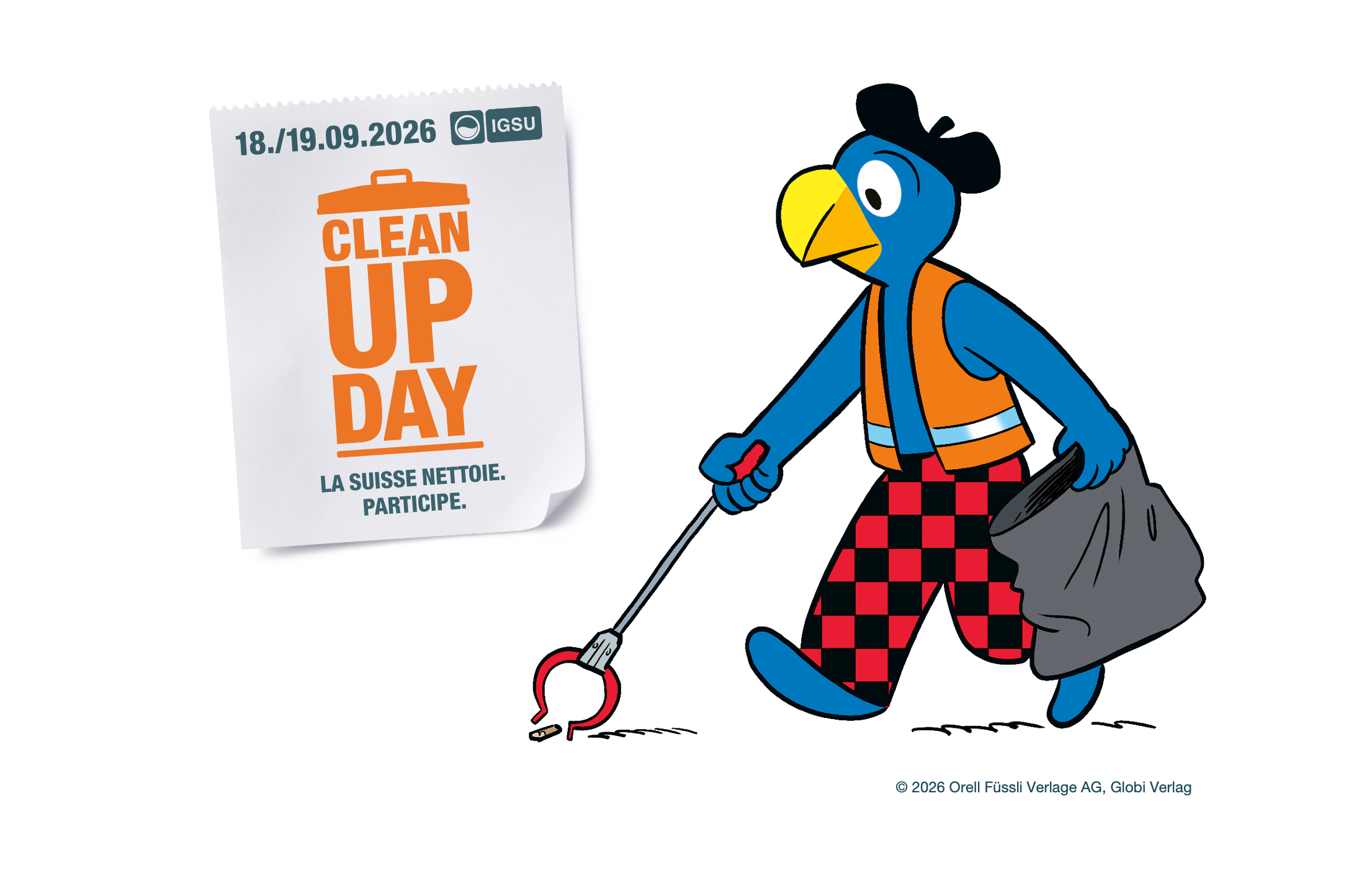 Depuis près de 100 ans, Globi enchante petits et grands. Il voyage à travers le monde, endosse sans cesse de nouveaux rôles et fait rire avec ses idées originales. Il s'engage en faveur de la sécurité, de la santé, de la protection de l'environnement et de la durabilité. «J’ai déjà été éboueur, mais j’ai aussi vu de mes propres yeux le fond de l’océan, le Tour de Suisse, le parc national et l’aéroport. J’ai exploré la Suisse, voyagé de Rome au Groenland et me suis fait de nouveaux amis en Afrique et dans le Far West», s’enthousiasme Globi. «Partout dans le monde, on trouve des endroits magnifiques et d’innombrables aventures, mais malheureusement aussi des déchets sauvages. La Suisse me tient particulièrement à cœur: pour que notre environnement reste propre, nous devons toutes et tous nous engager.» C’est pourquoi il se mobilise en faveur du Clean-Up-Day national IGSU les 18 et 19 septembre 2026 et envoie un signal fort contre les déchets sauvages.