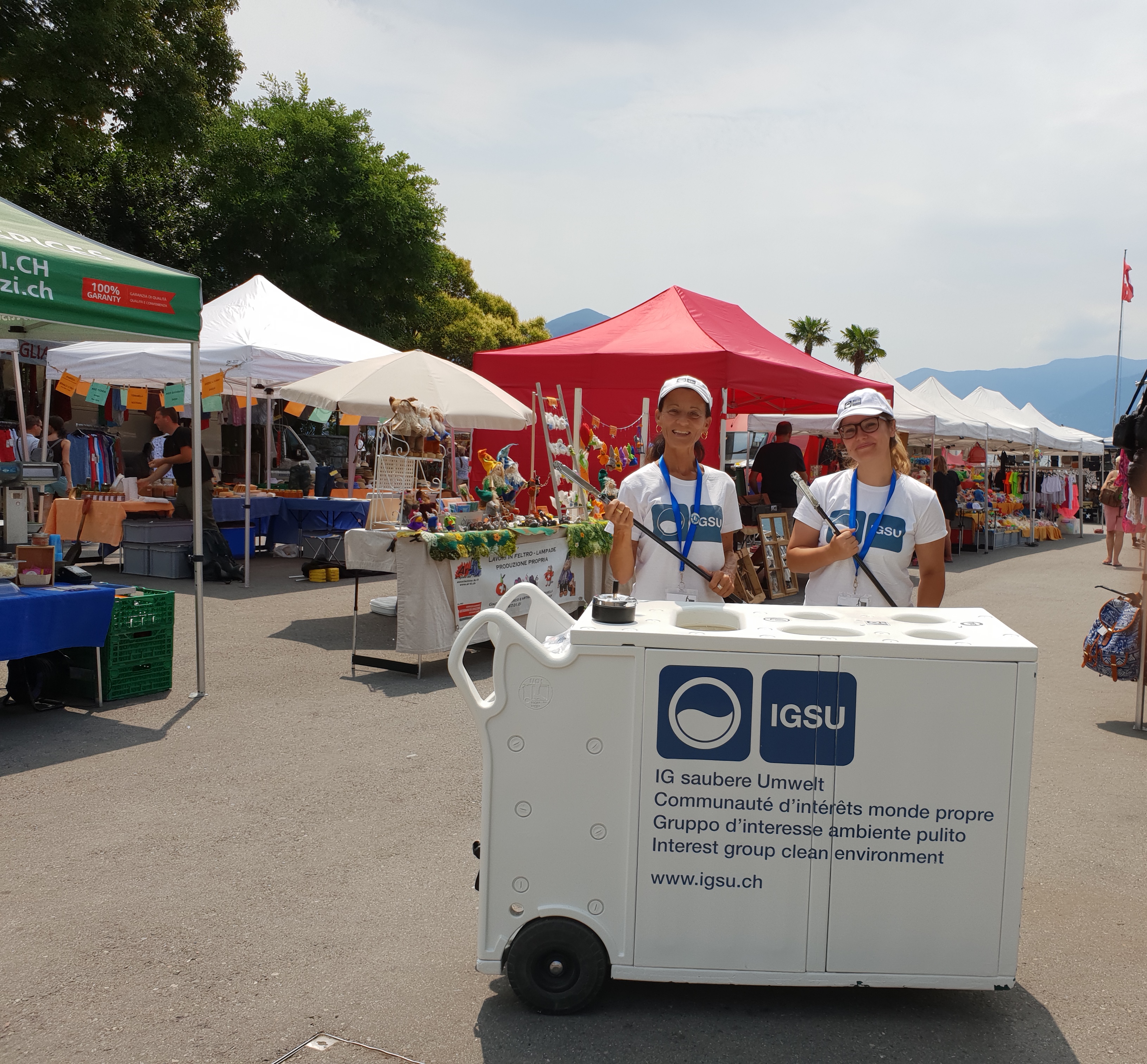 Da maggio, i team degli ambasciatori IGSU percorrono regolarmente il mercato settimanale di Ascona e s’intrattengono con i visitatori sulle tematiche del littering e del riciclaggio. Anche oggi incoraggiano la popolazione locale e i turisti a smaltire correttamente i loro rifiuti.